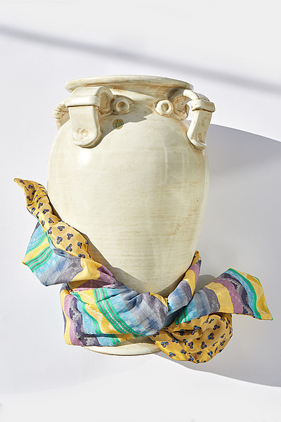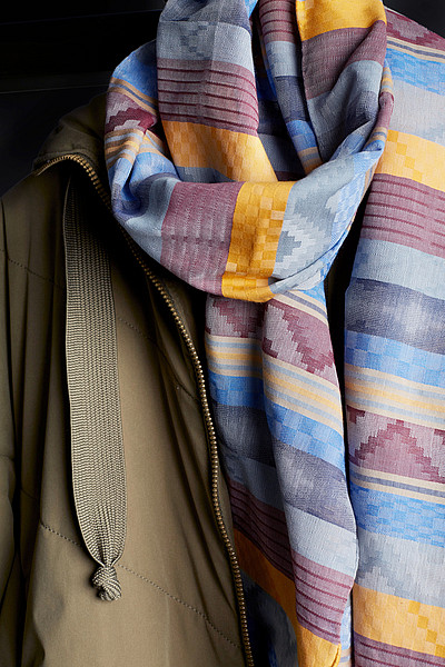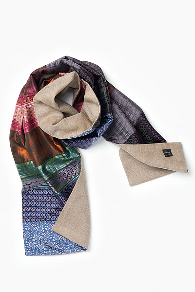 Schal doppelseitig: Uni beige mit Seidenpatchwork grün, orange, violett